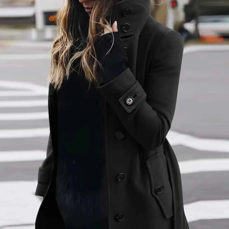 Dieser Damen Mantel überzeugt durch seinen geraden Schnitt und die doppelreihige Knopfleiste. Er ist vielseitig tragbar und lässt sich ideal zu Hosen, Kleidern oder Röcken kombinieren.